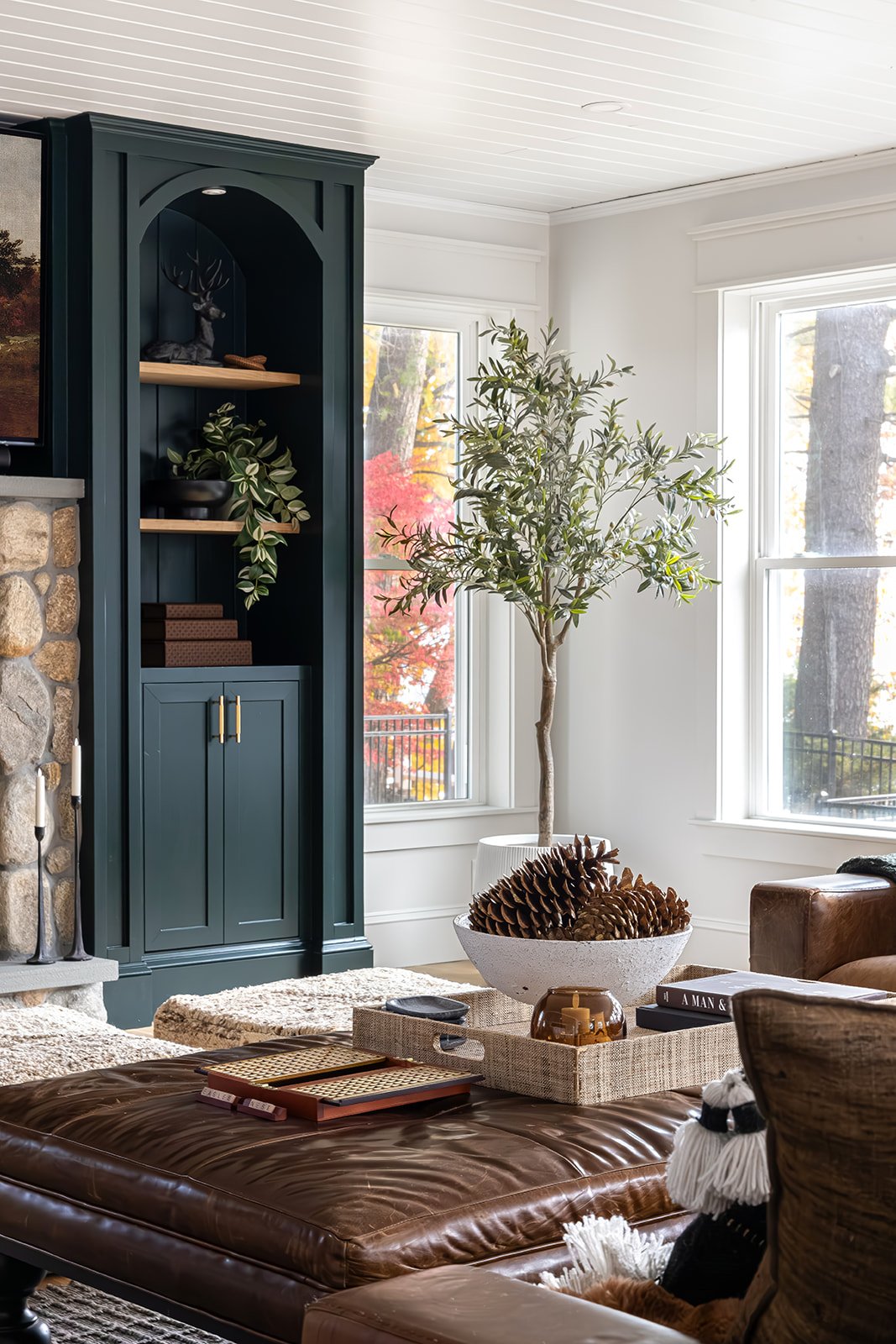 A new family room addition on a serene waterfront property. This design embraces lakeside living with camel tones, rich greens, and organic textures; quiet luxury inspired by its natural surroundings.